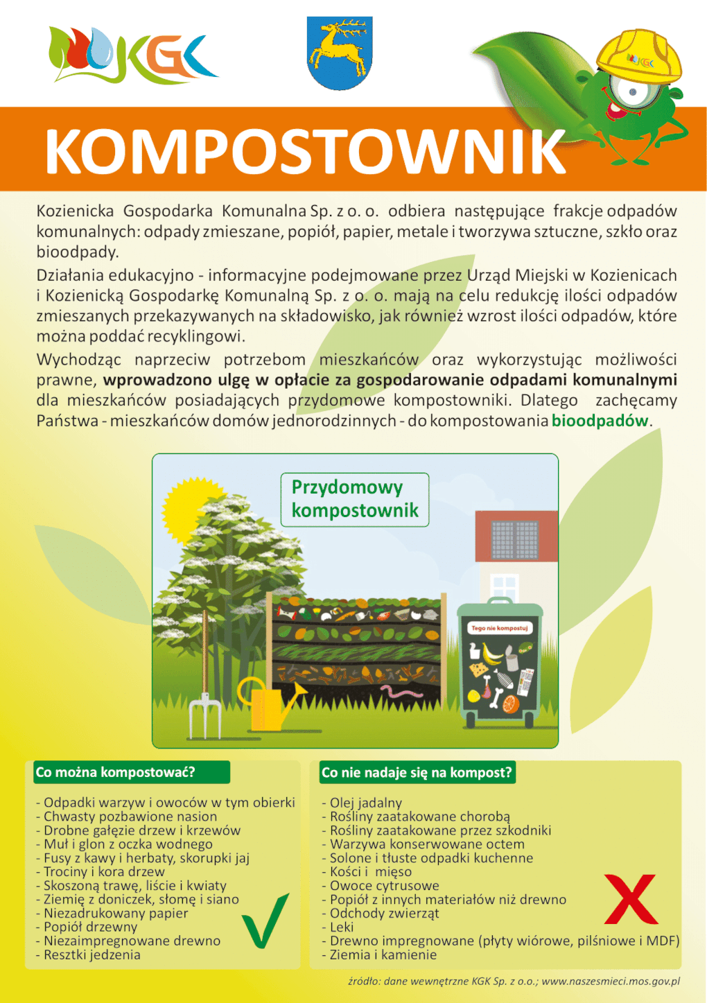 Informuję, iż na podstawie Uchwały Nr XX/252/2020 z dnia 30 czerwca 2020 r. Rady Miejskiej w Kozienicach (Dz. Urz. Województwa Mazowieckiego z 2020 r., poz. 7921) od 1 sierpnia 2020 r. wprowadzone zostanie zwolnienie w części z opłaty za gospodarowanie odpadami komunalnymi dla właścicieli nieruchomości zabudowanych budynkami mieszkalnymi jednorodzinnymi kompostujących bioodpady stanowiące odpady komunalne w kompostowniku przydomowym w wysokości 3 zł miesięcznie od każdego mieszkańca zamieszkującego daną nieruchomość.